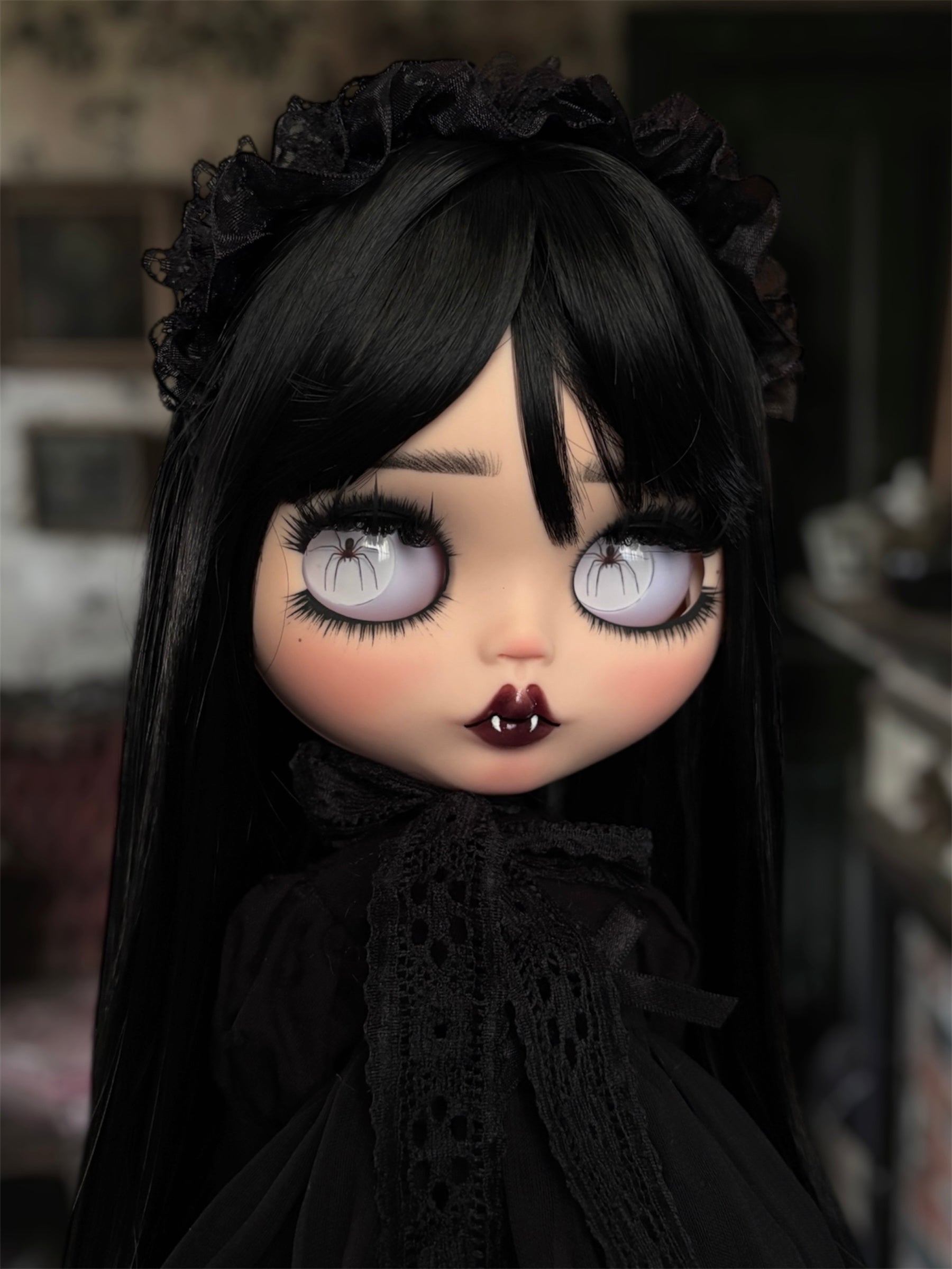Eleanore, a custom factory Blythe doll. She is an art doll & may have slight imperfections. All of her customization is done by me (dollhouseoddities) This custom was given a wig so please be extra careful while handling. She is not meant to be heavily played with/ is not for children. All dolls will travel with the full outfit in photos & extra pairs of changeable hands.