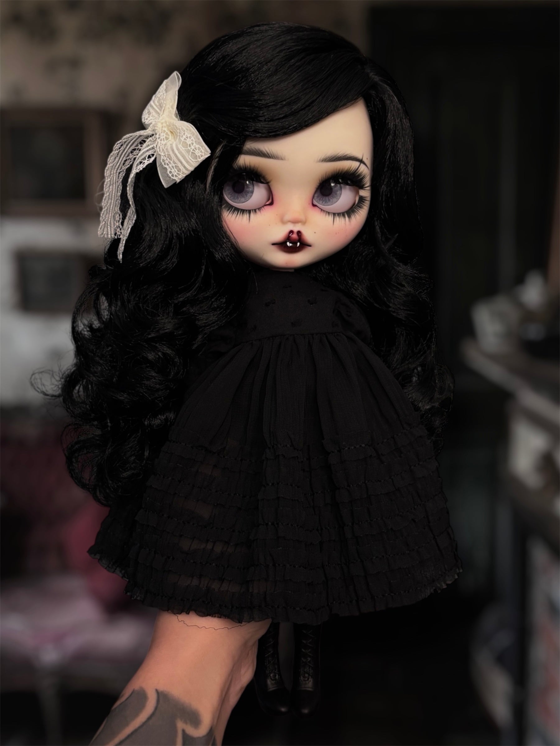 Lilith, a custom factory Blythe doll. She is an art doll & may have slight imperfections. All of her customization is done by me (dollhouseoddities) She is not meant to be heavily played with/ is not for children. All dolls will travel with the full outfit in photos & extra pairs of changeable hands.