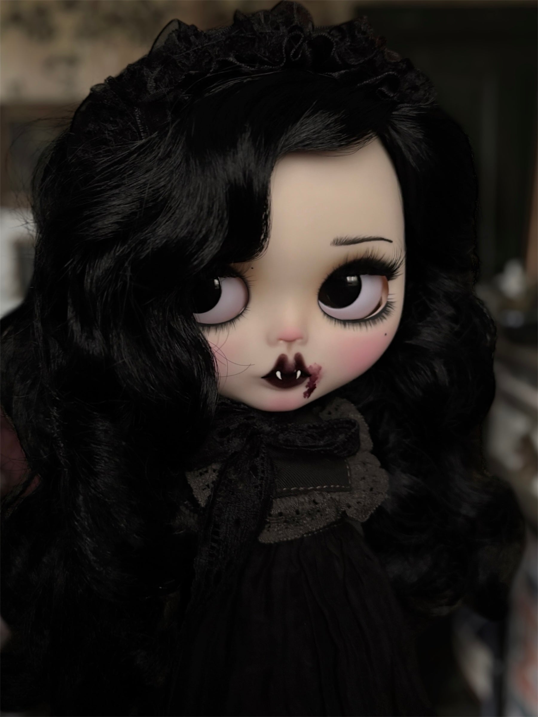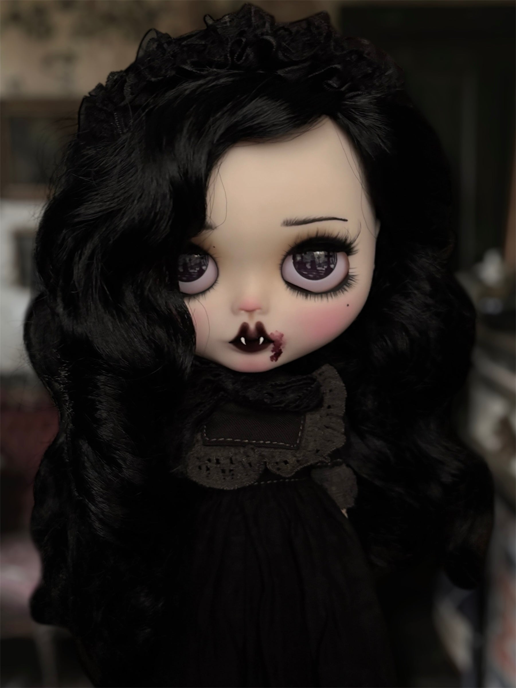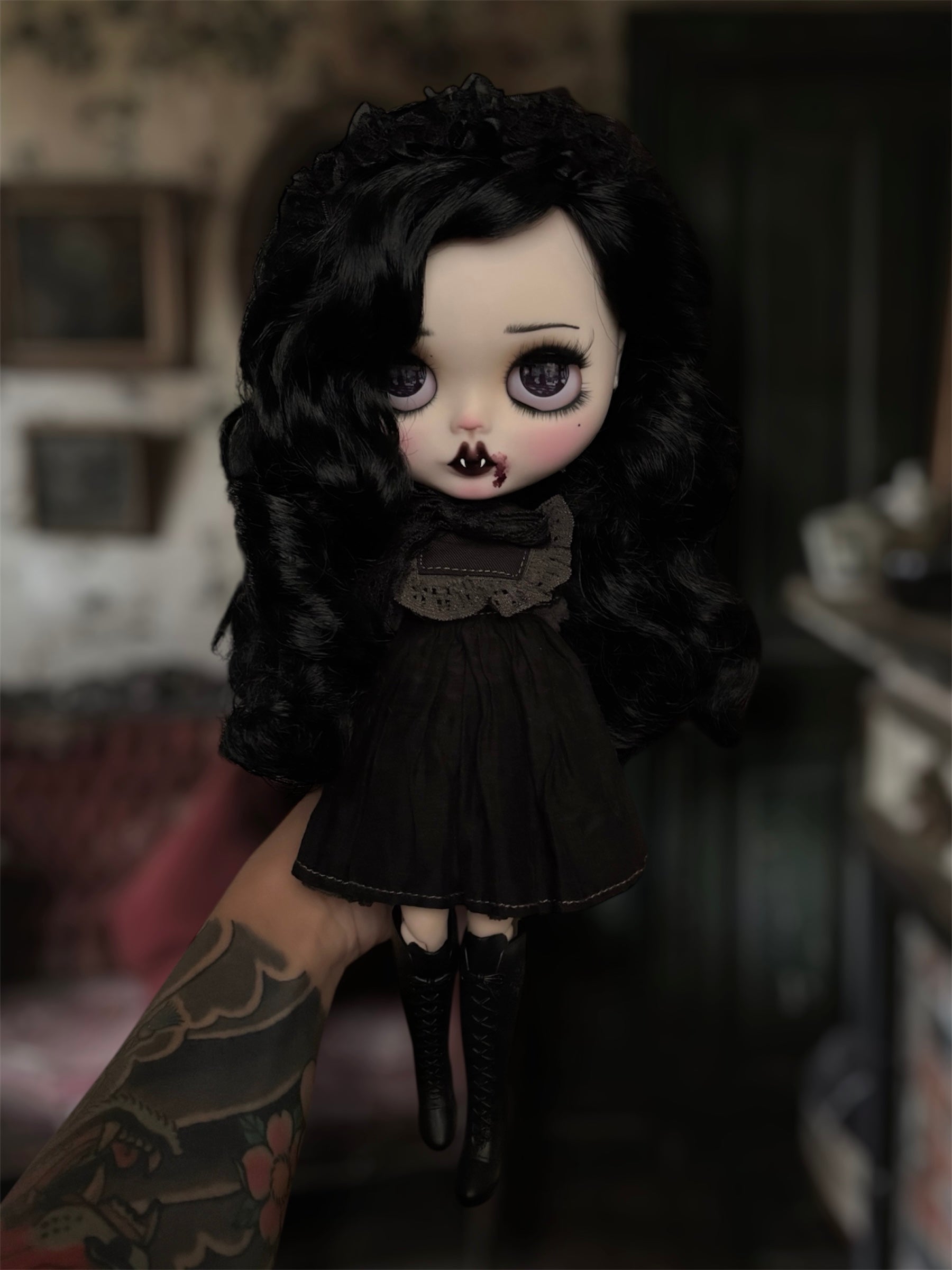 Lottie, a custom factory Blythe doll. She is an art doll & may have slight imperfections. All of her customization is done by me (dollhouseoddities) This custom was given a wig so please be extra careful while handling. She is not meant to be heavily played with/ is not for children. All dolls will travel with the full outfit in photos & extra pairs of changeable hands.