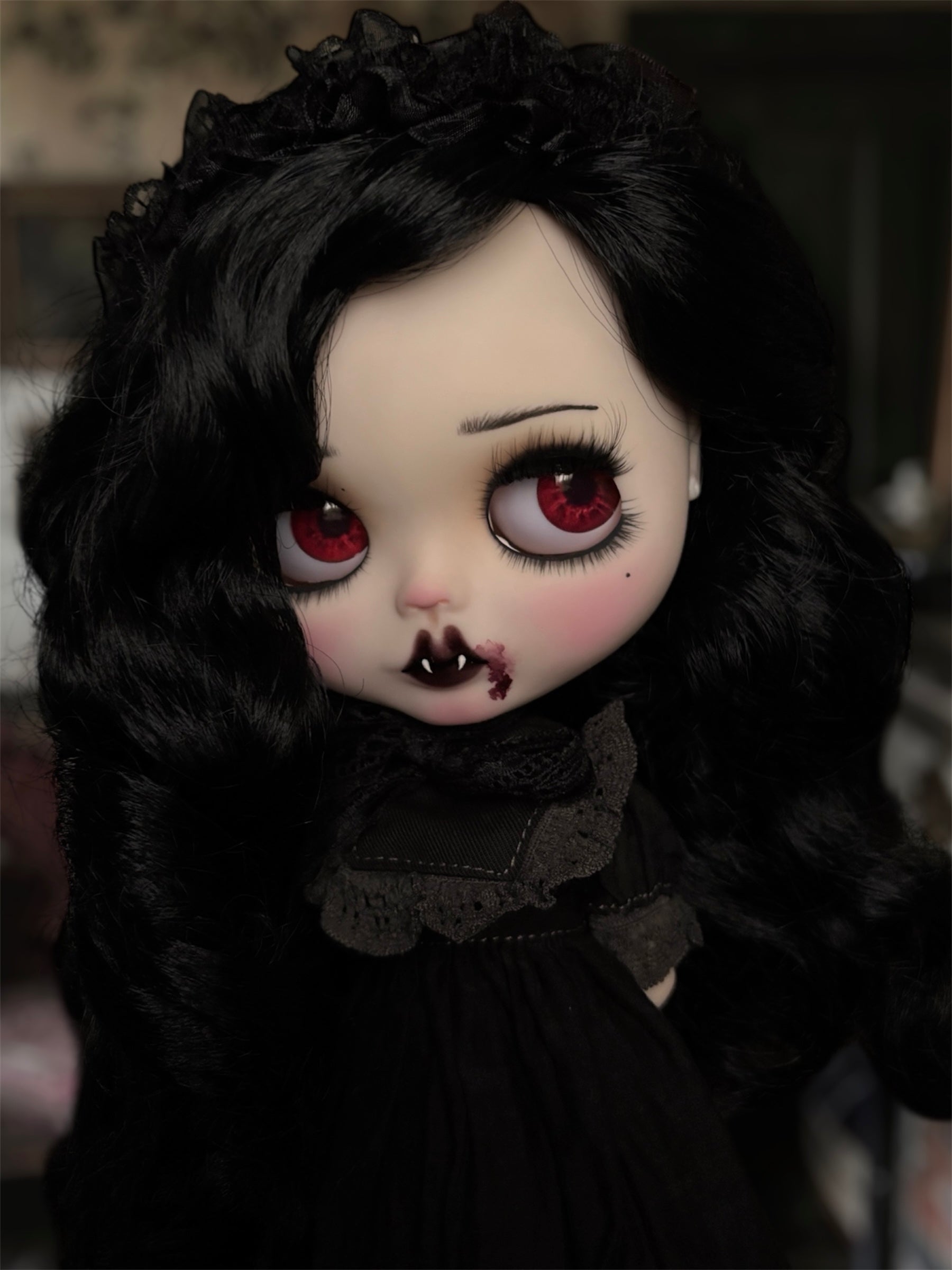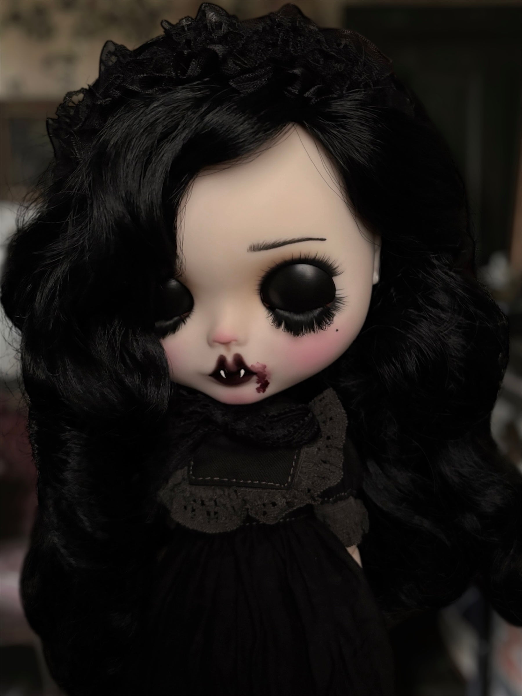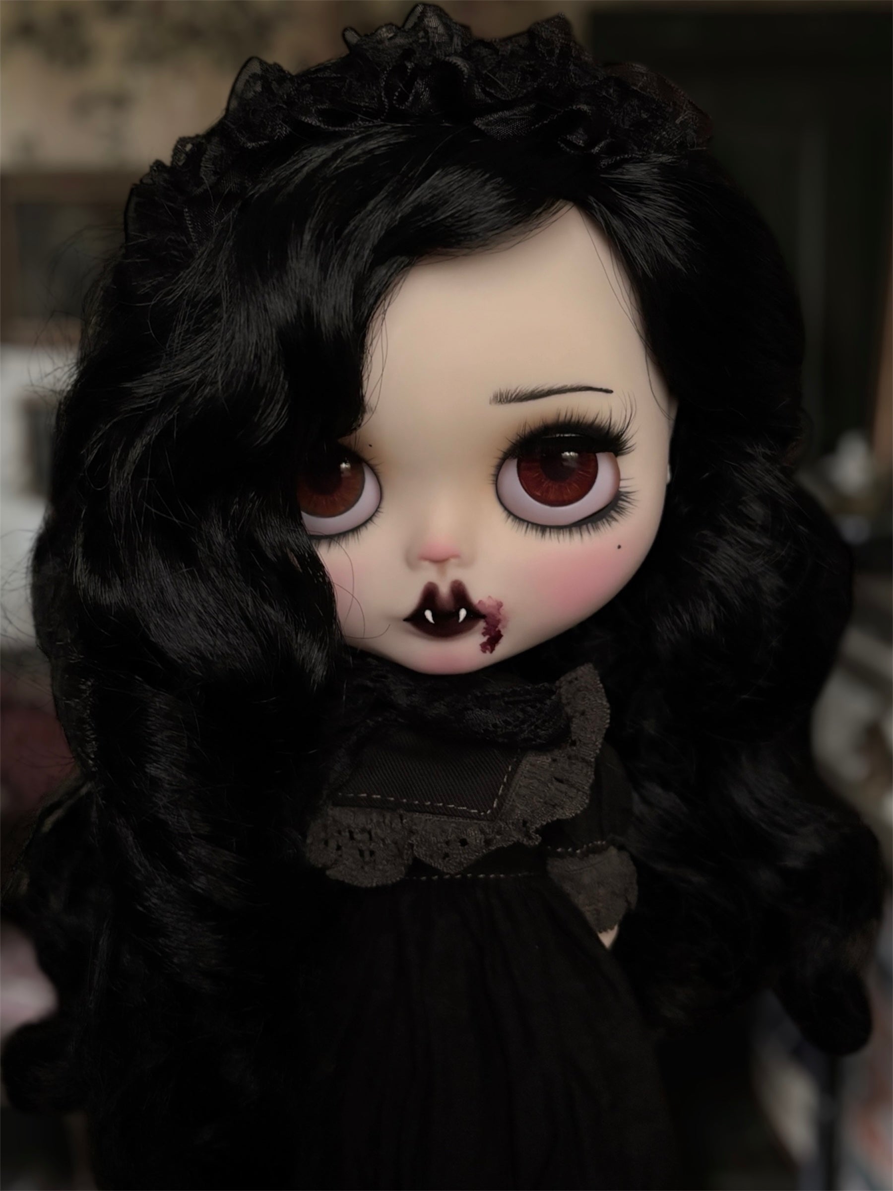 Lottie, a custom factory Blythe doll. She is an art doll & may have slight imperfections. All of her customization is done by me (dollhouseoddities) This custom was given a wig so please be extra careful while handling. She is not meant to be heavily played with/ is not for children. All dolls will travel with the full outfit in photos & extra pairs of changeable hands.