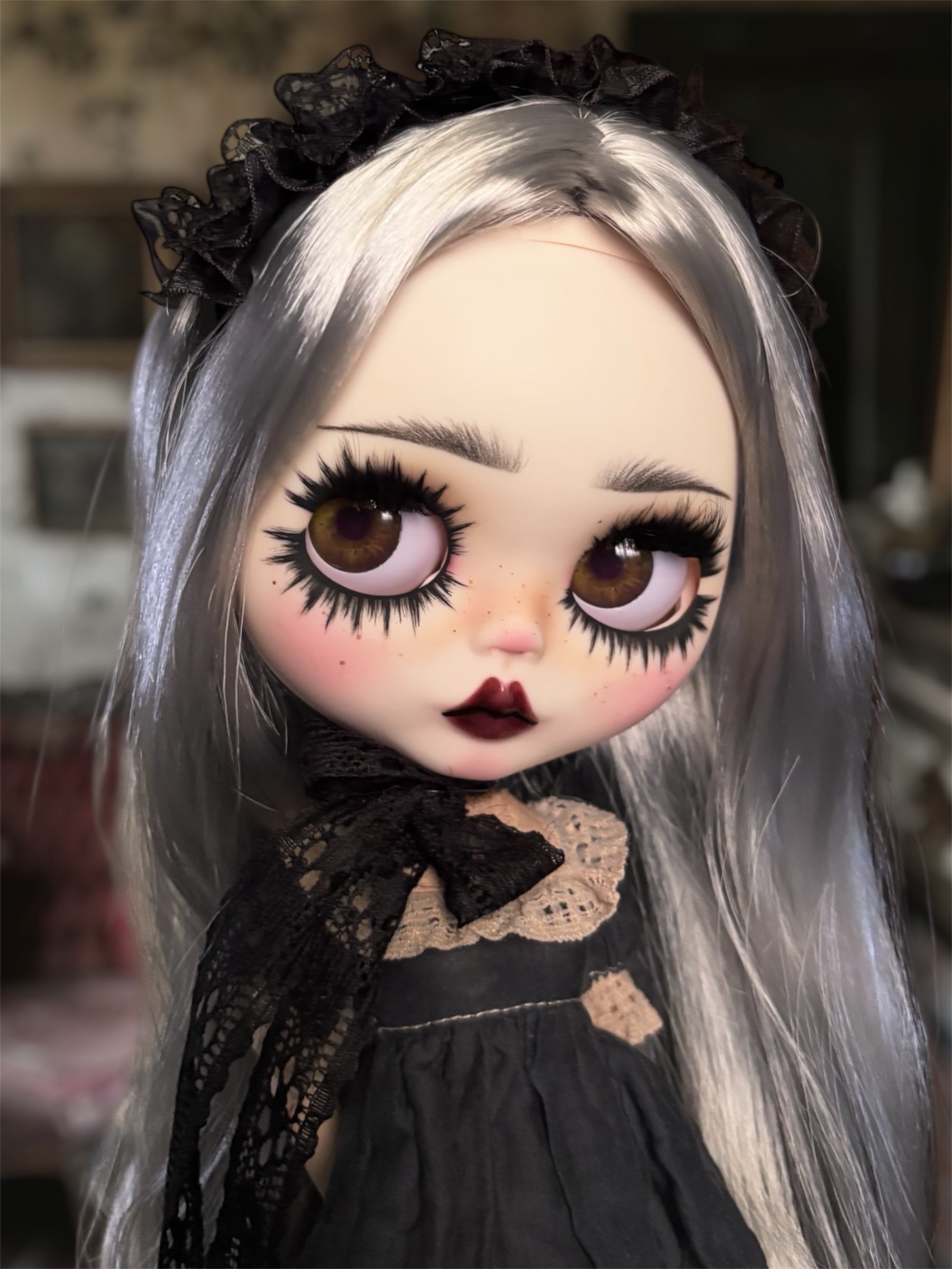Cecia, a custom factory Blythe doll. She is an art doll & may have slight imperfections. All of her customization is done by me (dollhouseoddities) She is not meant to be heavily played with/ is not for children. All dolls will travel with the full outfit in photos & extra pairs of changeable hands.